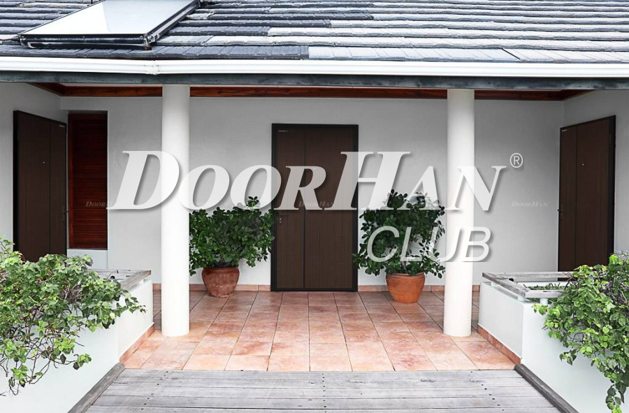 С наружной и внутренней стороны полотно имеет текстурированную поверхность цвета «венге», а также декоративный молдинг, окрашенный в цвет рамы — черно-коричневый (RAL 8022).