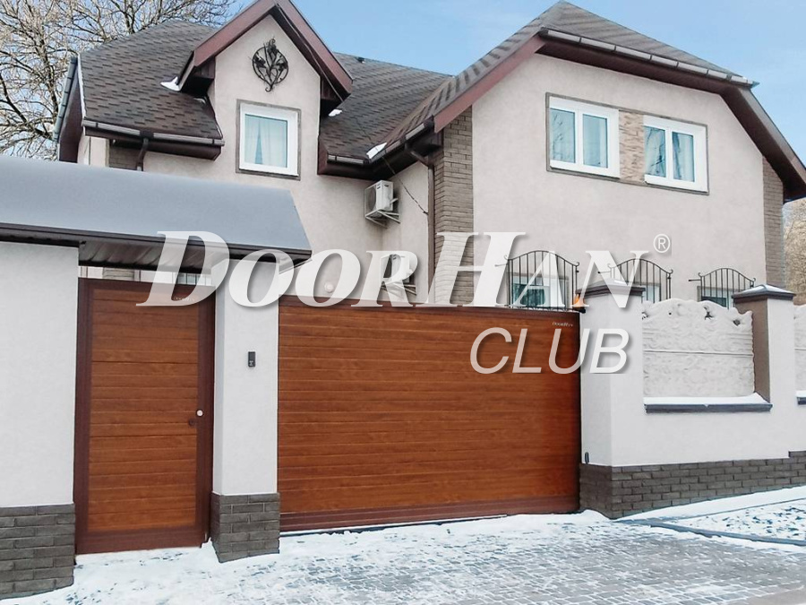 Откатные ворота DoorHan используются для ограждения небольших территорий с дефицитом места. Они экономят пространство, легко сдвигаются в сторону от проема, не требуют места для открытия створок и очистки въезда от снега. Отделка сэндвич-панелями с имитацией фактуры дерева придает им интересный вид, делает более изысканными.