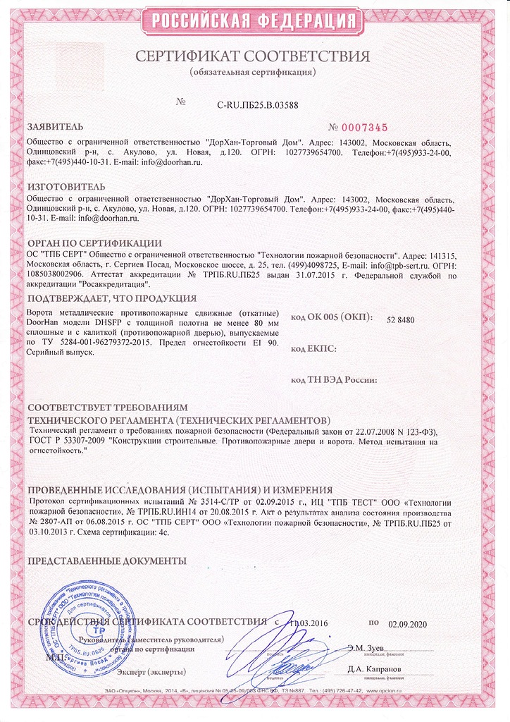 Противопожарные откатные ворота – одна из разновидностей огнеупорных и дымонепроницаемых конструкций, основное назначение которых заключается в изоляции помещения при пожаре. Створки до определенного момента не деформируются под воздействием высоких температур. Для изготовления применяются специальные материалы: оцинкованная сталь, наполнитель (обычно минеральная вата). Предел огнестойкости характеризуется показателями EI60 – один час, EI90 — полтора часа.